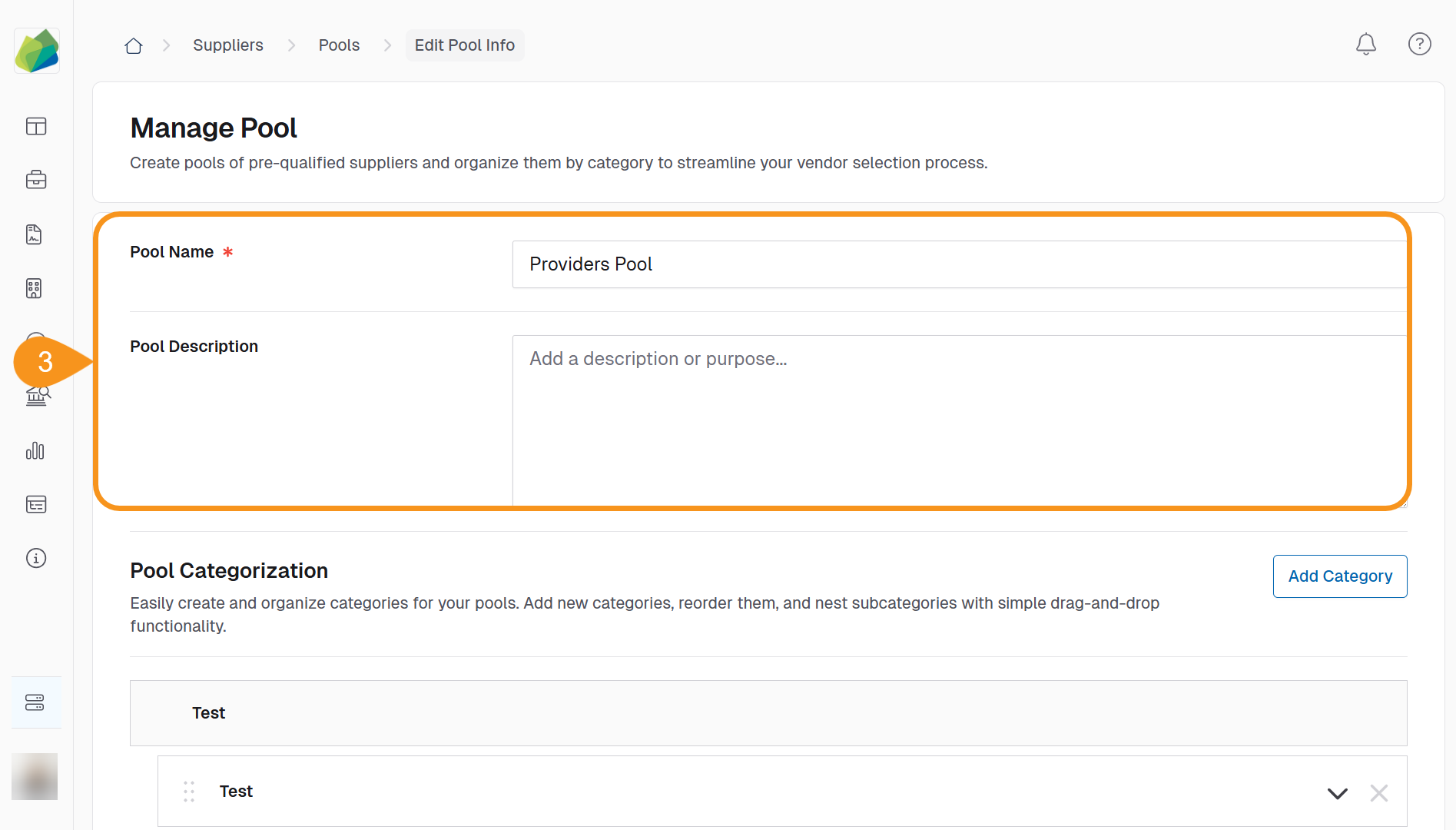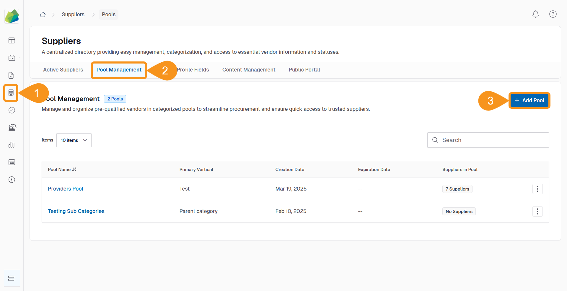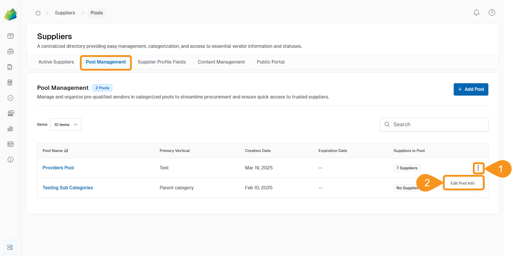 Supplier pools allow you to categorize vendors into searchable groups for prequalification, filtering, and organization. Pools can include categories and subcategories to match your sourcing needs.